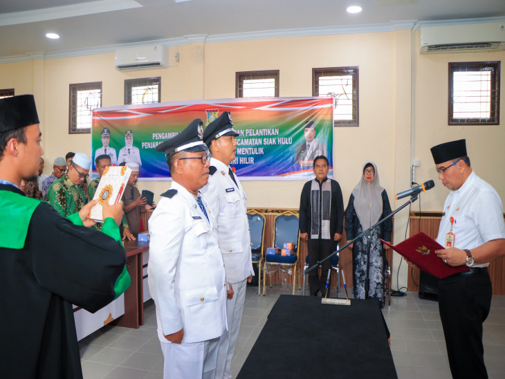 BANGKINANG KOTA - Bupati Kampar Ahmad Yuzar,S.Sos,MT yang diwakili Kepala Dinas Dinas Pemberdayaan Masyarakat dan Desa Kabupaten,  Lukmansyah Badoe,S.Sos,M.Si resmi melantik dua Penjabat Kepala Desa dilingkungan Pemerntah Daeeah Kabupaten Kampar, Rabu (13/8/2025). Turut hadir pada pelantikan Pj Kepala Desa ini yakni Camat Kampar Kiri Hilir Abukhari, M. Pd, Perangkat pelantikan dan keluarga Pj Kepala Desa yang di Lantik.