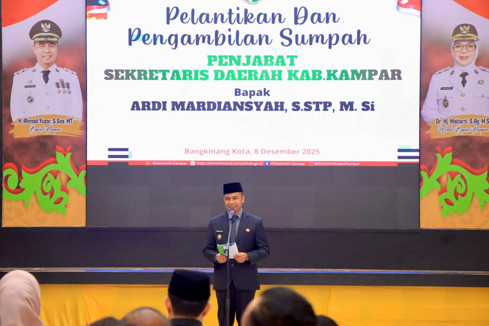 Bangkinang Kota – Berdasarkan SK Nomor: 634/BKPSDM/XII/2025, Bupati Kampar Ahmad Yuzar, S.Sos, MT resmi melantik dan Mengambil Sumpah Ardi Mardiansyah, S.STP, M.Si sebagai Penjabat Sekretaris Daerah (Pj Sekda) Kabupaten Kampar. Pelantikan ini dilaksanakan di Aula Balai Bupati Kampar, Senin (08/12/2024).
