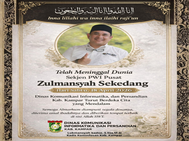"Kami atas nama pribadi dan sebagai Kepala Dinas Kominfo Kampar mengucapkan duka mendalam atas berpulangnya Sekjen PWI Pusat yang juga mantan Ketua PWI Riau Dua Periode, Bapak Zulmansyah Sekedang," ucapnya Sabtu (18/4/2026) pagi.