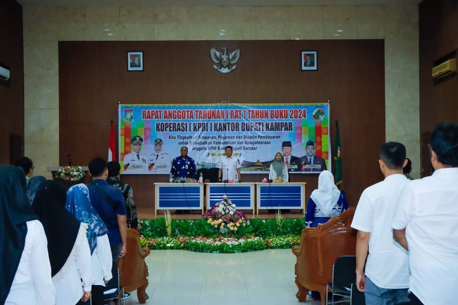 Bangkinang Kota – Bupati Kampar yang diwakili oleh Sekretaris Daerah (Setda) Kabupaten Kampar, Hambali SE MBA MH, secara resmi membuka Rapat Anggota Tahunan (RAT) Koperasi Pegawai Republik Indonesia (KPRI) Kantor Bupati Kampar Tahun Buku 2024 yang bertemakan "Tingkatkan Simpanan, Pinjaman dan Disiplin Pembayaran untuk Mewujutkan Kemandirian dan Kesejahteraan Anggota KPRI Kantor Bupati Kampar.