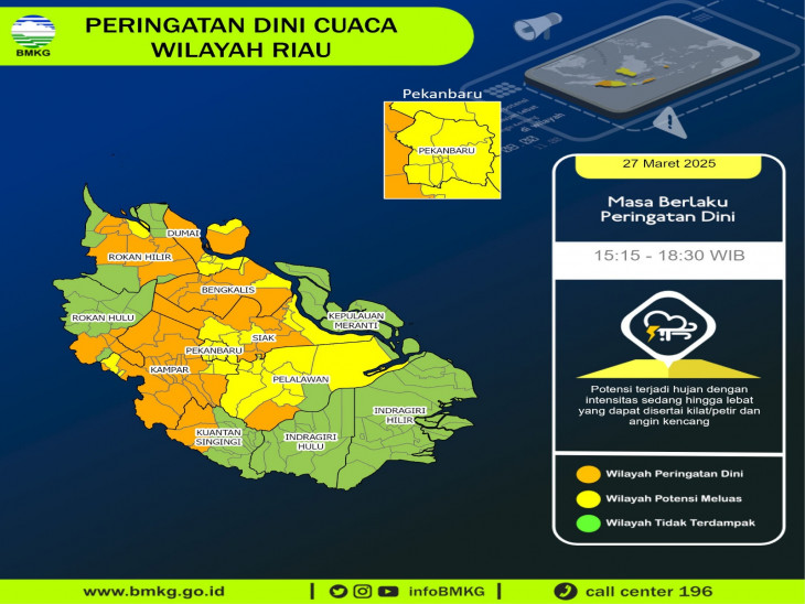 Bangkinang :  Berdasarkan informasi terkini dari BMKG Provinsi Riau *UPDATE Peringatan Dini Cuaca Riau* tgl 27 Maret 2025 pkl 15:05 WIB masih berpotensi terjadi Hujan Sedang-Lebat yang dapat disertai Kilat/Petir dan Angin Kencang pada pkl. 15:15 WIB di :