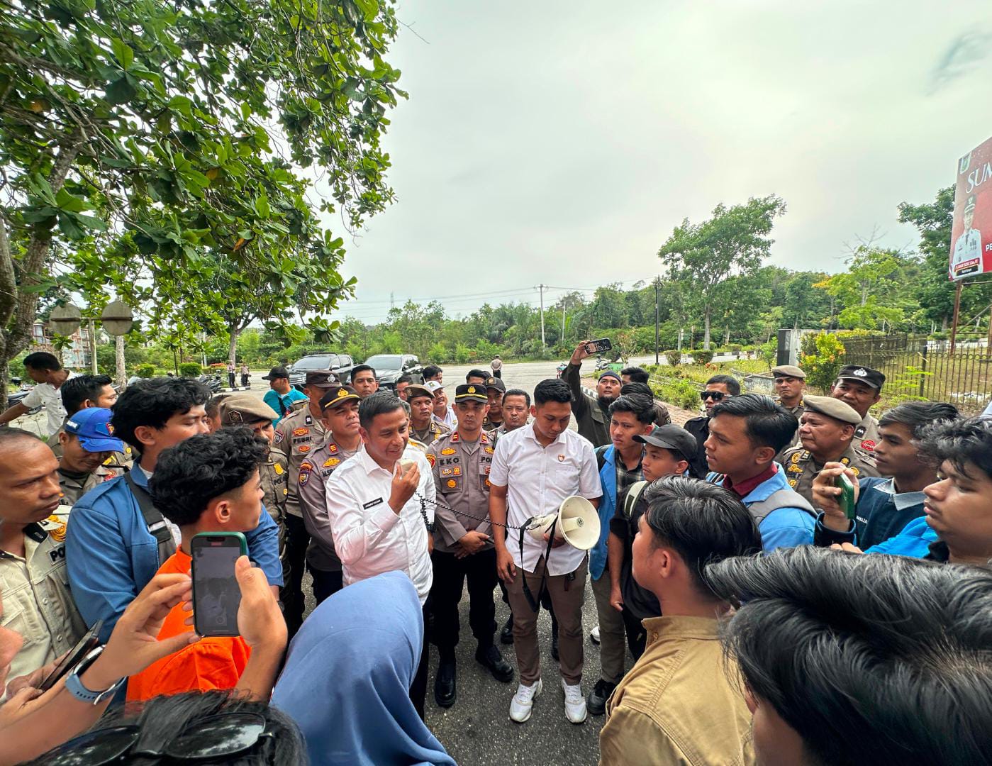 Bangkinang Kota : Bupati Kampar mendatangi langsung Aksi Damai yang digelar Aliansi Mahasiswa Kampar Pekanbaru yang digelar di Kantor Bupati Kampar dan Balai Bupati Kampar, Rabu 29 Oktober 2025 yang diikuti lebih kurang 26 orang tersebut yang di koordintori oleh Muhammad Wahyudi dan Korlap Supriadi.