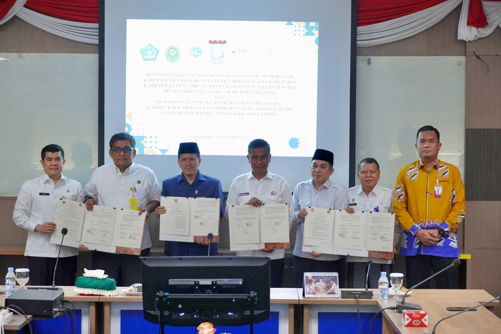 Bangkinang Kota,- Bupati Kampar Ahmad Yuzar.S.Sos. MT tandatangani nota kesepakatan antara Pemerintah Kabupaten Kampar dengan Kementerian Agama Kabupaten Kampar, Pengadilan Agama Bangkinang Kelas I B, BPN Kantor Pertanahan Kabupaten Kampar dan PT BPD Riau Kepri Syariah (Perseroda) di Ruang Rapat Lantai III Kantor Bupati Kampar, Rabu (31/12).